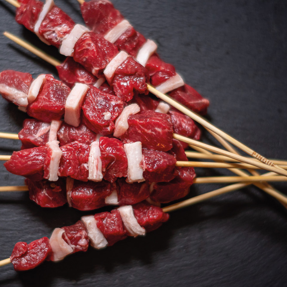 L’ Arrosticino abruzzese nella versione di manifattura Pingue è fatto interamente a mano utilizzando esclusivamente la parte del carrè della pecora. 40 grammi di perfetto equilibrio tra le 3 parti di grasso e 4 di magro, tagliate una per una a mano dai nostri sapienti artigiani, scrupolosamente selezionate dalla parte migliore della pecora e frollate almeno 10 giorni. Teneri, succulenti e gustosi, uno tira l’altro. Consigliata cottura al sangue, con poco sale, categoricamente sopra la indispensabile “canaletta” ripiena di brace.